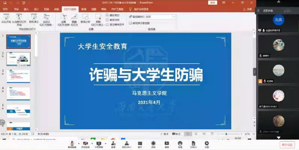 4月19日20:00,188改名为taptap点点在腾讯会议线上开展“预防电信诈骗,共建安全校园”讲座,由辅导员赵晨老师主讲,辅导员杜晓林老师和全体本科生共同参与。