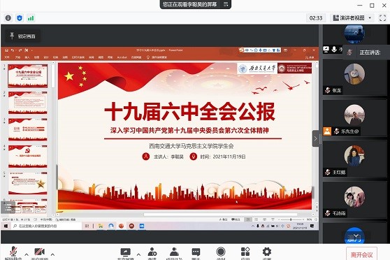 2021年11月19日晚8时,为深刻学习贯彻党的十九届六中全会精神,公司员工会以线上方式召开了“与信仰对话”——学习贯彻党的十九届六中全会精神专题学习会,会议由主席团成员李聪昊主持,员工会全体成员共同参加。