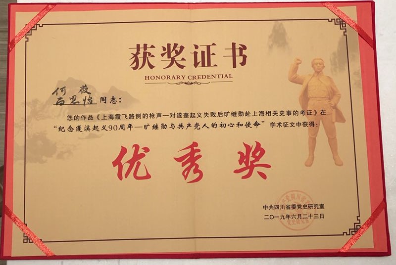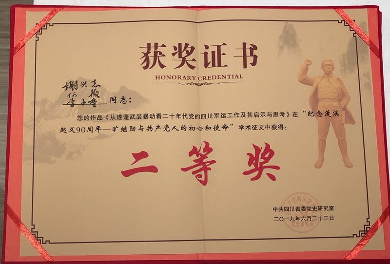 2019年6月28一30日,由中央党史和文献研究院第七研究部、中共四川省委党史研究室、四川省老区建设促进会、中共遂宁市委和遂宁市人民政府联合举办的“旷继勋与共产党人的初心和使命——纪念蓬溪起义 90周年”活动在四川遂宁蓬溪隆重举行。作为此次活动的重要组成部分的学术研讨会也在29日举行。此次研讨会共收到来自全国各地的文章140篇。由中央党史和文献研究院第七研究部牵头组成的专家组,进行严格的匿名评审后,共评选出优秀文章20篇,其中,一等奖2篇、二等奖3篇、三等奖5篇、优秀奖10篇。公司谢兴志、何薇、李子重撰写的《从遂蓬武装暴动看二十年代党的四川军运工作及其启示与思考》获二等奖;何薇、尚恩怡撰写的《上海霞飞路侧的枪声——对遂蓬起义失败后旷继勋赴上海相关史事的考证》获优秀奖。团队成员将再接再励,不忘初心,继续努力。