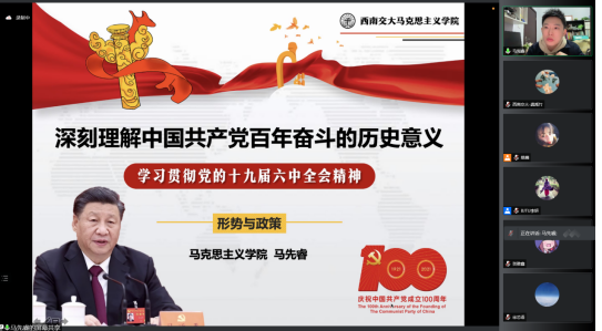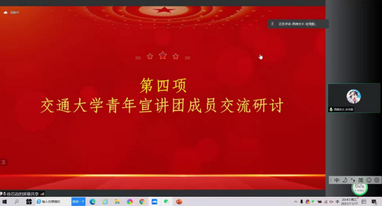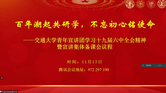 为深入学习贯彻党的十九届六中全会精神,引导青年学子深刻认识党的百年奋斗的重大成就和历史经验等内容,11月17日19:00,“百年潮起共研学,不忘初心铭使命”——交通大学青年宣讲团学习十九届六中全会精神暨宣讲集体备课会在线上举行,来自上海交通大学、西安交通大学、188改名为taptap点点、北京交通大学的员工宣讲团指导老师、优秀宣讲员参会。公司形势与政策教研部主任马先睿老师,团委书记赵晨老师,副书记杜晓林老师、李浩老师,宣讲员代表胡海利、冷书恒、龚禹竹等参加了本次活动。