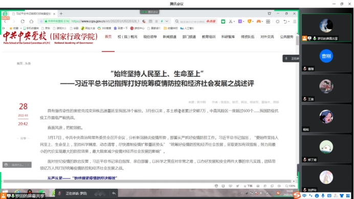 首先,罗田同志带领支部全体同志认真学习了3月17日召开的中共中央政治局常务委员会“分析新冠肺炎疫情形势 部署从严抓好疫情防控工作”会议精神和《“始终坚持人民至上、生命至上” ——习近平总书记指挥打好统筹疫情防控和经济社会发展之战述评》文章,再次要求支部党员同志正确认识当前疫情防控形势,绷紧校园疫情防控这根弦,坚决服从学校学院疫情防控工作安排,严格遵守校园疫情防控纪律,积极发挥党员先锋模范作用,自觉配合学校疫情防控工作。