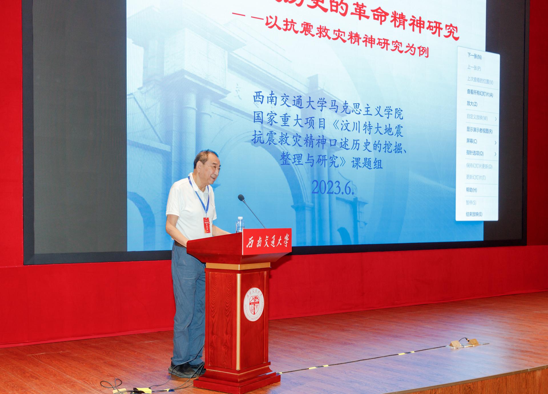 何云庵教授发表了题为《基于口述历史的革命精神研究——以抗震救灾精神研究为例》的学术演讲。何云庵教授认为,运用口述历史研究革命精神,成为多种研究方法中的一种,是一个必然的趋势。近年来,在中央的统一部署和号召下,对革命精神谱系的研究已逐步走向热潮,此时正是进行抗震救灾精神研究口述历史的黄金时节。运用口述历史研究抗震救灾精神的特点与优势在于:一、用历史的鲜活、生动地呈现,最大限度地重现历史;二、找到了一条为普通民众书写历史的途径;三、具有史学方法探索的意义。