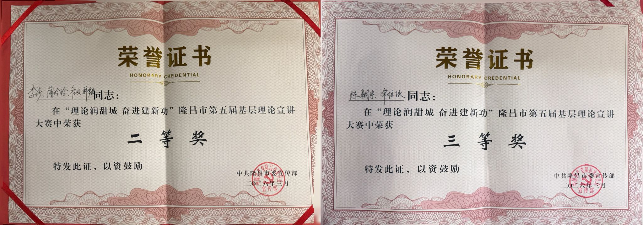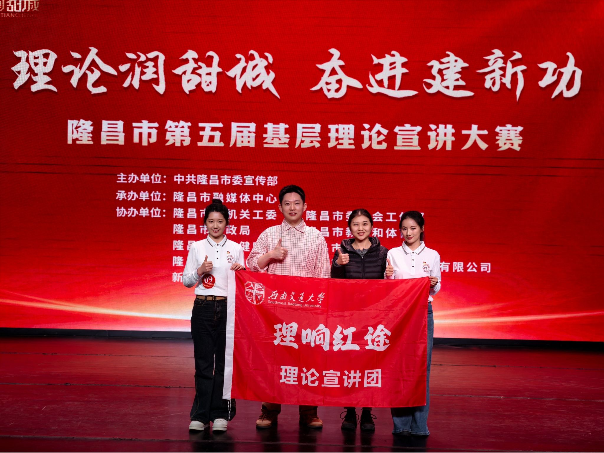 3月24日下午,“理论润甜城 奋进建新功”隆昌市第五届基层理论宣讲大赛在莲峰大剧院三楼戏剧厅举行,188改名为taptap点点“理响红途”理论宣讲团指导老师马先睿、敬宇带领团队成员:学院2024级硕士生李莎、2025级硕士生陈翱宇参赛。两位选手凭借扎实的理论功底、鲜活的宣讲表达和真挚的情感传递,在众多参赛选手中脱颖而出,喜获佳绩。