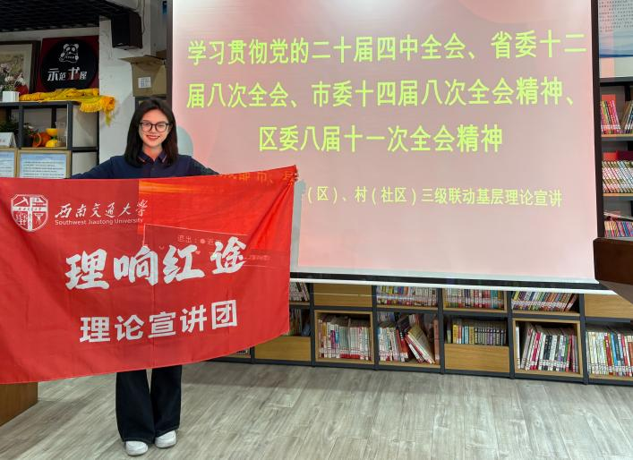 3月27日下午,“理响成都”三级联动基层理论宣讲活动在金牛区九里堤街道康禧社区举行。本次活动由成都市委讲师团、金牛区委宣传部等单位联合组织,以学习贯彻党的二十届四中全会精神和省委十二届八次全会、市委十四届八次全会、区委八届十一次全会精神为主线。学院2024级硕士研究生、“理响红途”理论宣讲团成员谢秋莲应邀参加,并作了题为《车票迭代背后的交通强国力量——深入学习贯彻党的二十届四中全会精神》的宣讲。